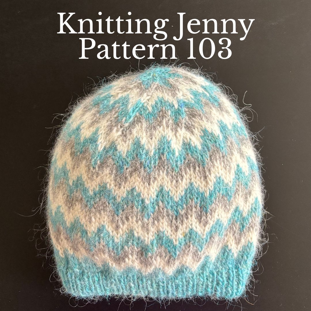 Knitting Jenny Pattern 103: Icelandic Léttlopi Wool Ski Hat features a classic, seamless zig-zag design, with swirling triangular segments converging at the crown.