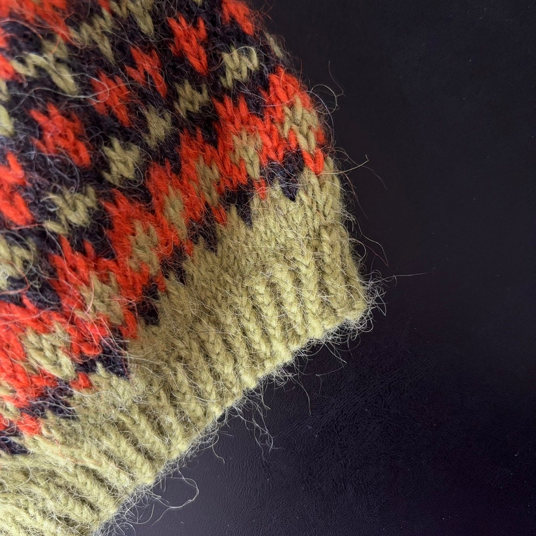 Knitting Jenny Pattern 109: Icelandic Léttlopi Wool Ski Hat features a classic seamless design of stranded colorwork, with triangular segments converging at the crown to create a kaleidoscopic star effect.