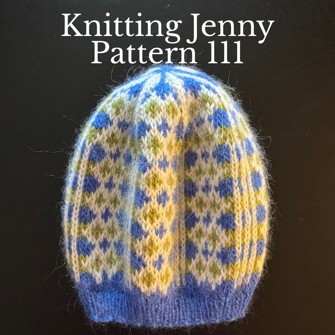 Knitting Jenny Pattern 111 creates an elastic and flexible ski hat that fits a size medium adult head with approximately 22 inches in head circumference. Instructions are included for size customization.