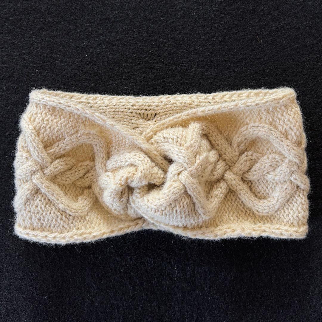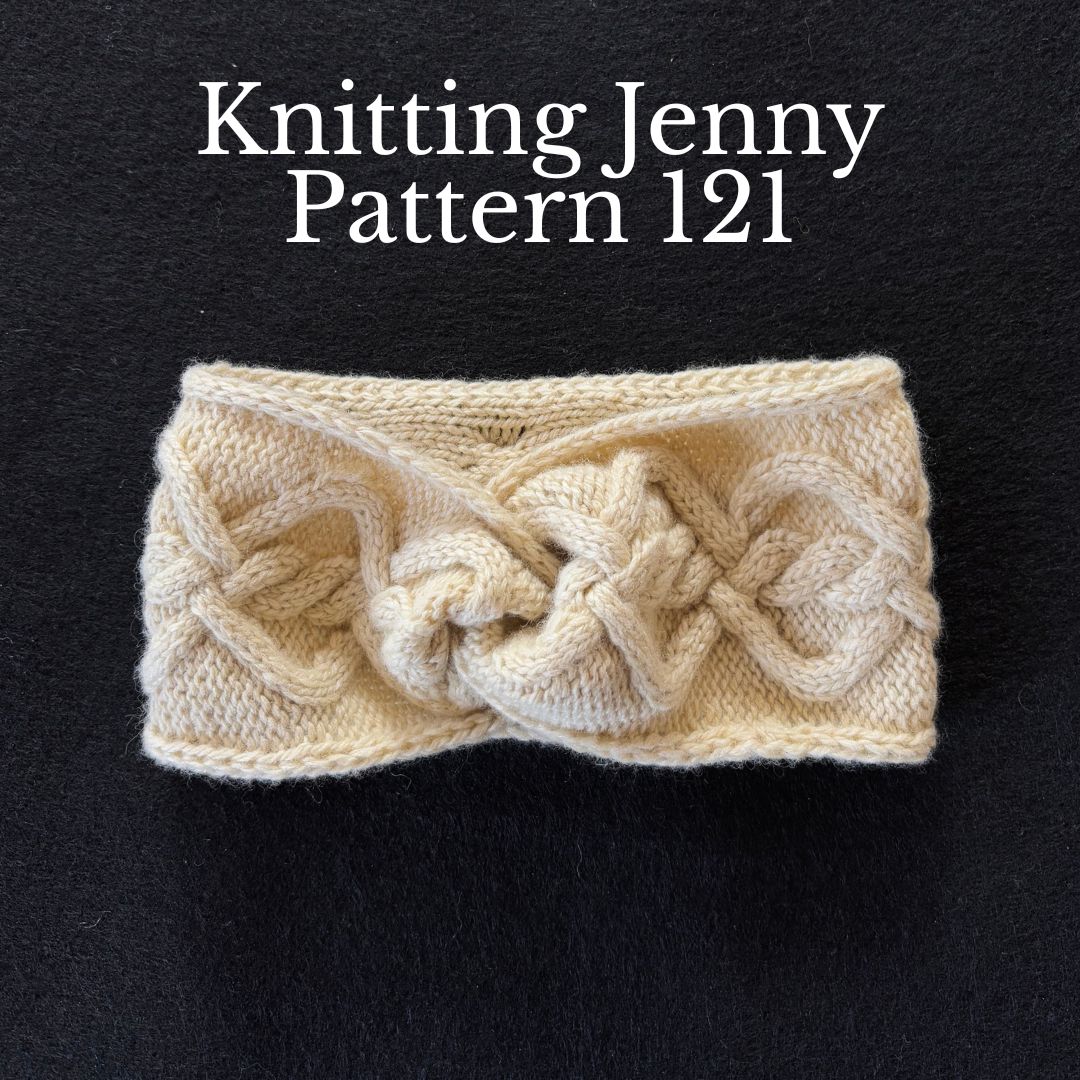 Knitting Jenny Pattern 121: Irish Aran Islands Inspired Cabled Headband showcases a classic textured design of integrated cables within cables and a knotted design feature.