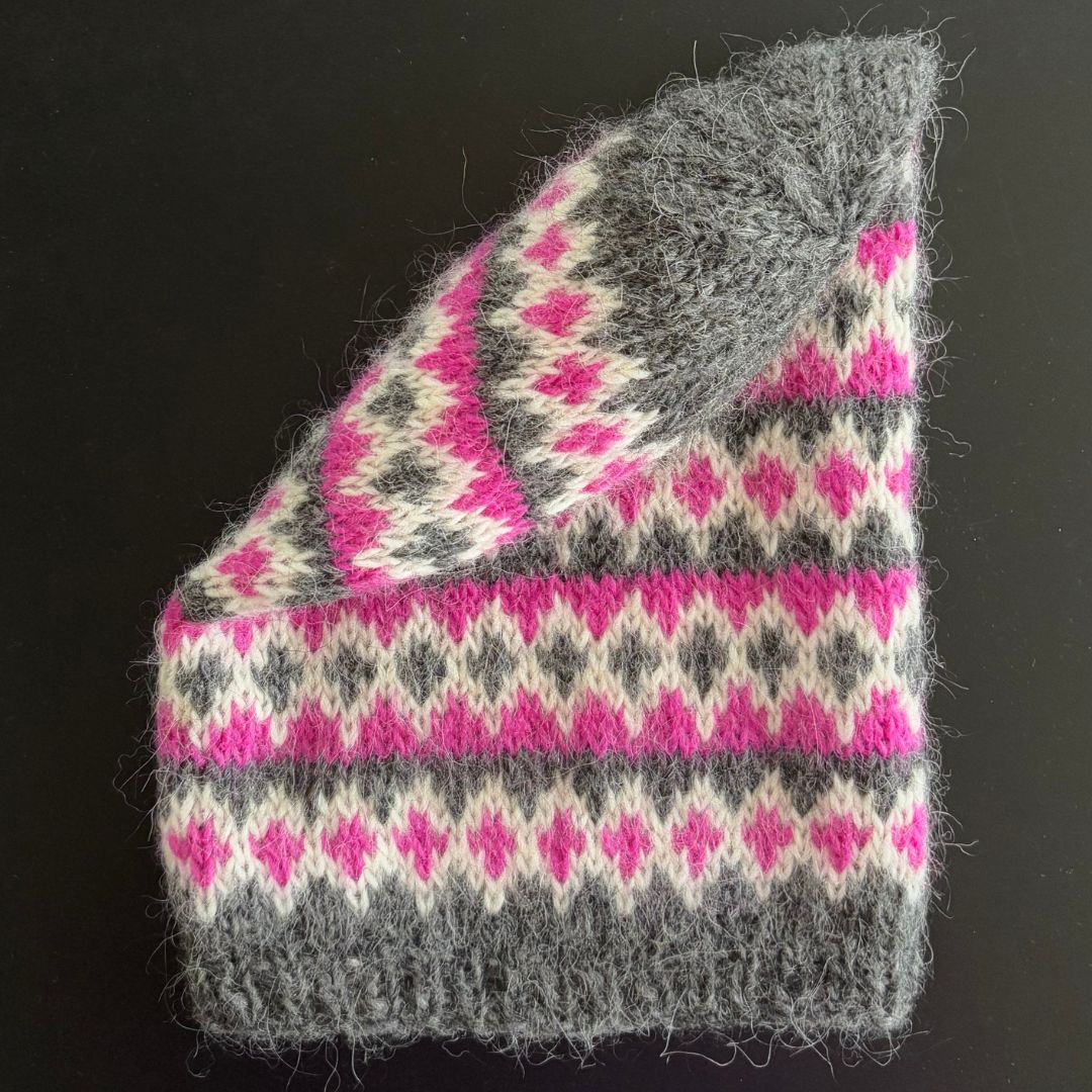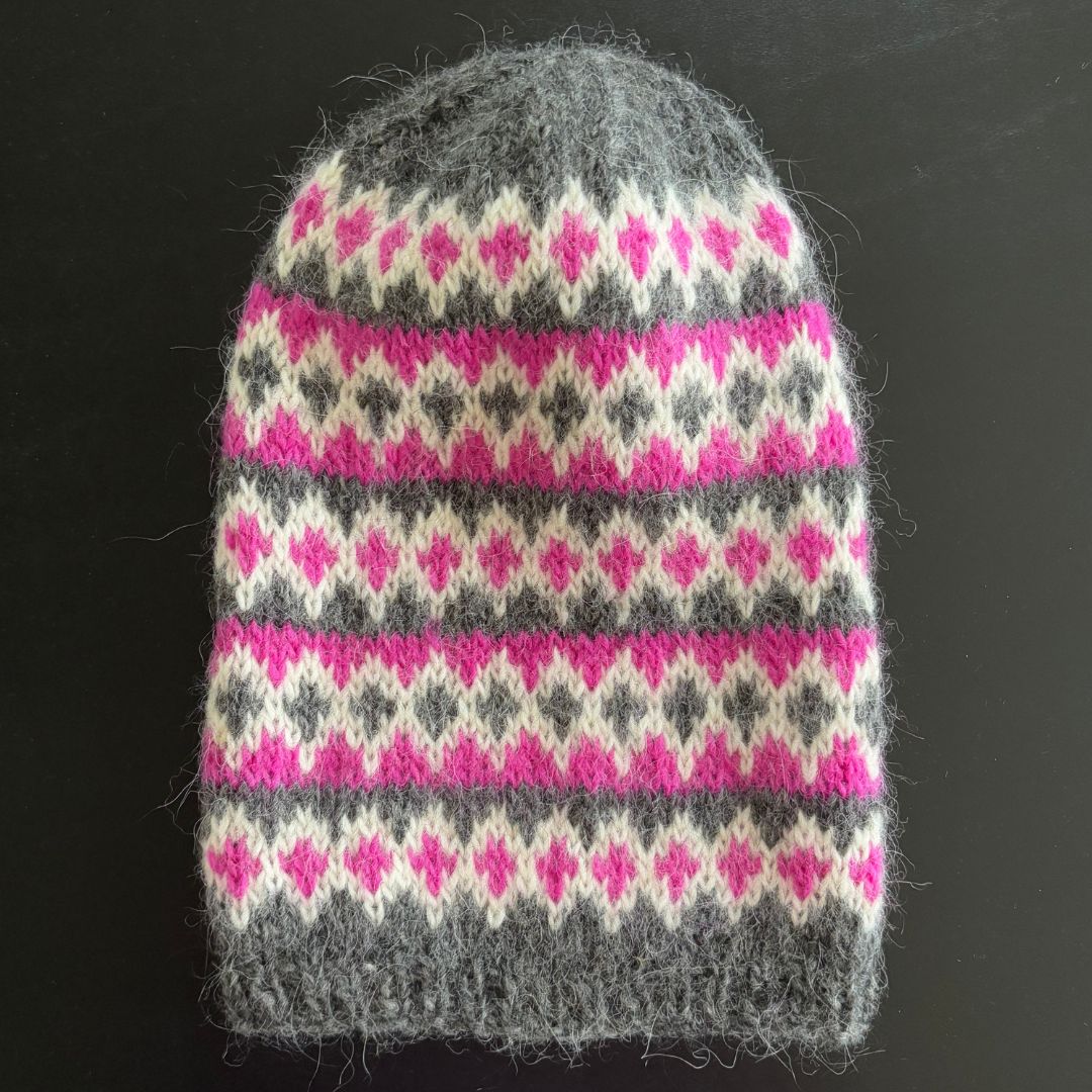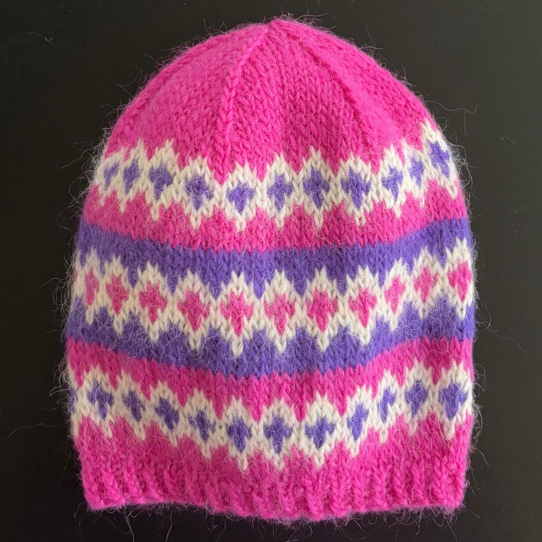 - Cast on, knit the brim, increase, knit the stranded colorwork of the head, then systematically decrease at the crown.