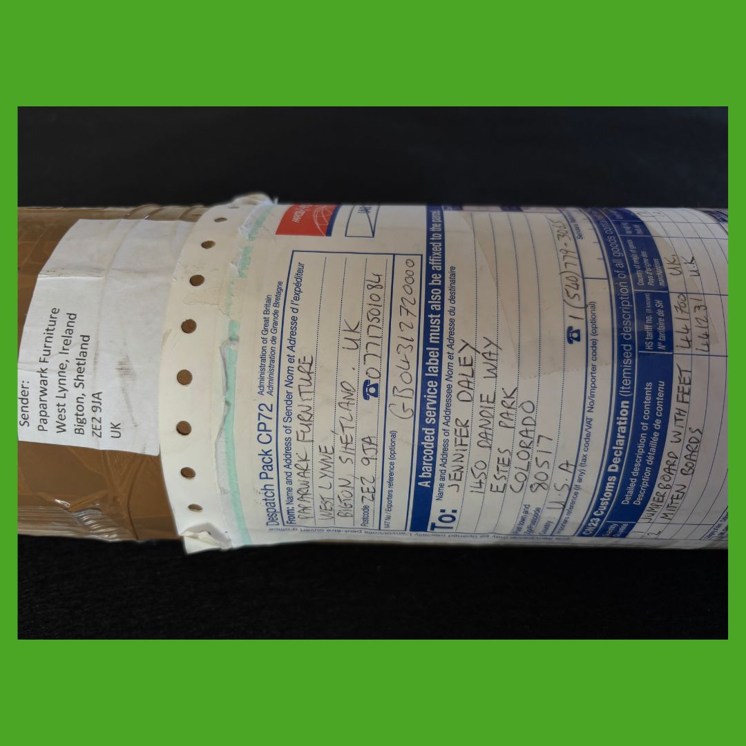 In British pounds: £155 (for the deluxe jumper board) + £15 (for the wooden feet, which are essential so the board will stand upright) + £34 (tax) + £70 (shipping from Shetland, Scotland to the United States) = £274 total (which is about $366 USD)