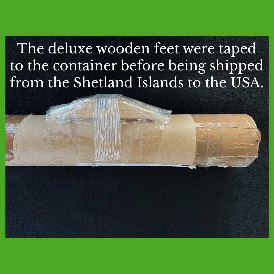 Traditional Shetland wooden jumper board used to block your wooly garments. Designed to fit multiple sizes using an adjustable pin method. Posted flat pack in a postal tube with assembly instructions and a link to an assembly video. Based on a traditional design that has been used in Shetland for generations. Made from Ash timber for great strength and durability. Location pins are stainless steel and therefore do not rust. The jumper board can now be be purchased with feet with means it can be free standing. The feet are also available for purchase and are sold in pairs and can fit all previous deluxe jumper boards.